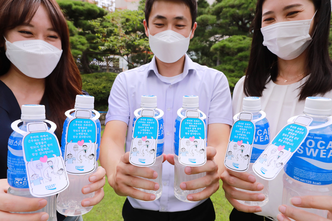 방역 최전선에서 땀 흘리는 의료진들의 수분 보충을 위한 포카리스웨트에 넥택(neck tag)을 달아 응원 메시지도 함께 전한다.