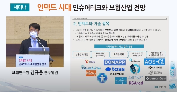 세미나의 마지막에는 김규동 보험연구원 연구위원이 ‘언택트 시대 보험 비즈니스 전망 및 규제 변화’를 주제로 발표했다.