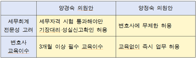 반면 양정숙 무소속 의원이 8월 18일 발의한 세무사법 개정안은 변호사에게 모든 세무대리 업무를 전면 허용하고, 교육이수도 필요 없다고 보았다.