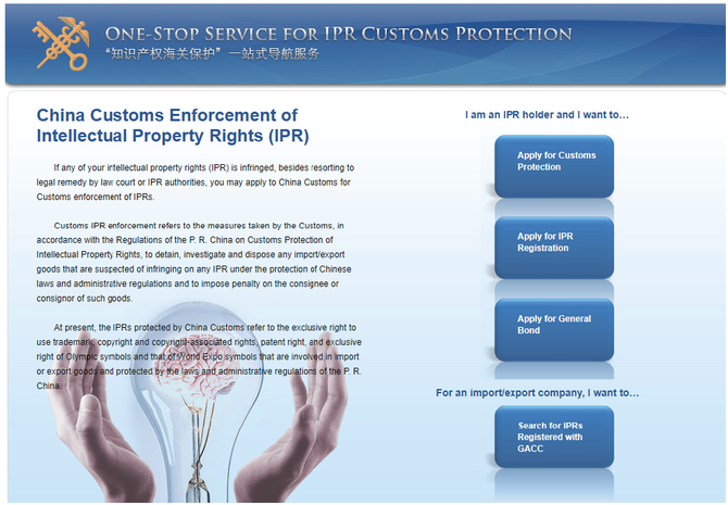 중국에서 지식재산권을 소유한 권리자는 중국 세관 총국에 등기를 할 수 있다. 등기를 할 수 있는 권리는 상표권, 저작권, 전리권, 저작인접권이다. 중국에서 전리권은 특허권과 디자인권을 의미하는데, 실제로 특허와 같은 경우 해당 기술의 내용을 제품만 보고 파악할 수 있는 경우가 많지 않기에 쉽지는 않다. 물론 특허의 경우에도 기계 분야의 특허는 육안으로도 판별이 가능할 수 있다. 그러나 세관의 업무는 신속함을 요하기 때문에 이러한 기술에 대하여 직권으로 오랜 시간을 투자하여 깊이 있게 판단할 수는 없다.