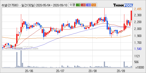 러셀의 2019년 매출액은 전년대비 31.3% 늘어난 410억원이고, 영업이익은 전년대비 -13.2% 줄어든 49억원을 기록했다. 이 회사의 매출액 증감률과 영업이익 증감률은 각각 코스닥 상위 17%, 하위 44%에 해당된다.