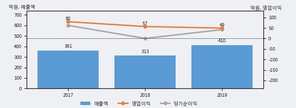 최근 실적을 살펴보면 2019년 매출액이 최근 3년 중 가장 높은 실적을 기록했음을 알 수 있다. 이전 최고 실적이었던 2017년 보다도 13.6%(49억 2천만원) 늘어난 것으로 나타났다.