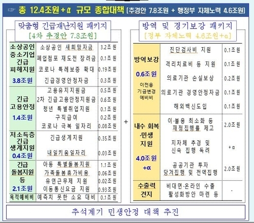 이번 대책은 7조8천억원에 달하는 4차 추경과 4조6천억원에 달하는 방역·경기보강 패키지로 구성했다.
