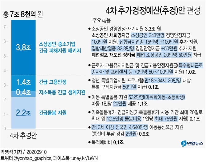 우선 4차 추경 자금 7조8천억원 중 약 절반인 3조8천억원을 사회적 거리두기 격상 조치 등으로 피해를 본 소상공인·자영업자에 새희망자금을 지급하기로 했다.