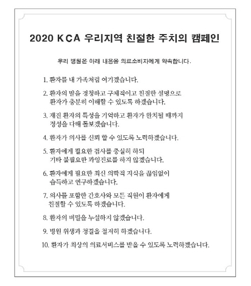 올해 신설된 ‘2020 KCA 우리지역 친절한 주치의 캠페인’은 국내 진료서비스에 대한 의료소비자의 높아진 눈높이를 충족시키기 위해 진료와 서비스 등에 대한 질적 향상을 꾀하며 코로나 19사태로 인해 의료소비자들이 병원 방문에 가지는 부담감을 해소하기 위한 수단으로 의료소비자들과 병원의 위생 안전성 및 높은 질의 의료서비스를 서약으로 약속하는데 그 의의가 있다.
