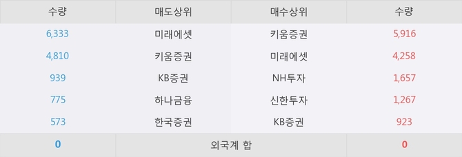 아직까지 외국계 증권사 창구를 통한 매매는 발생하지 않고 있다. 그리고 이 시간 미래에셋이 매수창구상위에 올라있는 종목은 이 종목 이외에도 신한 인버스 2X WTI원유 선물 ETN(H), KMH 등이 있다.
