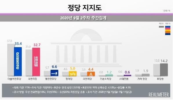 정당 지지도는 민주당 33.4%, 국민의힘 32.7%였다. 민주당은 전주보다 4.4%포인트 내렸고 국민의힘은 1.7%포인트 올랐다.