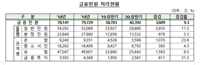 금감원이 상반기 중 처리한 민원 수는 작년 상반기보다 9.3% 많은 4만2천392건이다.