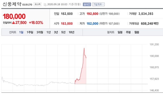 신풍제약은 코스피, 코스닥지수가 연중 최저치를 기록했던 지난 3월 19일 이후 이달 17일까지 당초 6610원에서 19만원대로 올라 30배 가까운 수익을 내는 중이다.