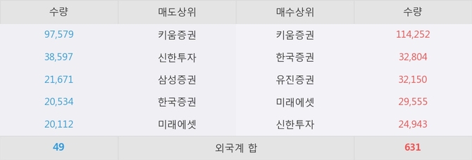 이 시각 주요 거래원은 미래에셋, 키움증권, 한국증권 등이 매수 상위 창구에 자리하고 있다.