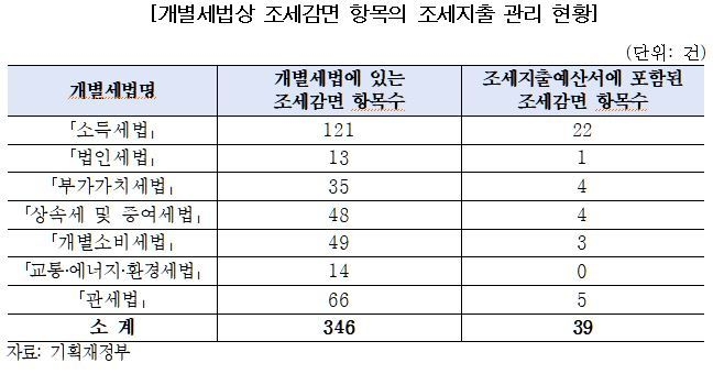 국회 기획재정위원회 더불어민주당 정성호 의원은 "정부가 개별세법상 조세지출 항목 346개 중 39개만 관리하고 있다"고 27일 밝혔다. 10개 중 1개꼴로 관리하고 있다는 것이다. 나머지 307개를 제대로 관리하지 못하고 있다는 의미다.