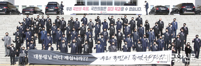 (조세금융신문=김용진 기자) 주호영 국민의힘 원내대표와 의원들이 28일 국회 본청 앞 계단에서 '북한의 우리 국민 학살만행 규탄 긴급의원총회'를 가졌다.
