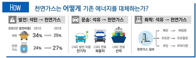 천연가스의 발전효율은 40%로 타 화석연료(석탄 34%, 석유 37%)와 비교해 상대적으로 높아 에너지 믹스에서 천연가스의 비중 역시 확대되고 있다.