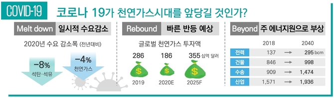 국제에너지기구(IEA)는 코로나19 천연가스 투자액이 2019년 2860억 달러에서 2020년 1860억 달러로 35% 감소할 것으로 하향 조정했으나, 2025년부터 2030년까지 연평균 약 3550억 달러로 급반등할 것으로 내다봤다.