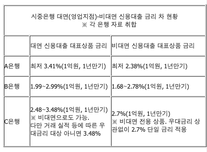 ◈인터넷은행과 경쟁에 비대면 금리, 대면보다 1%p이상 낮기도
