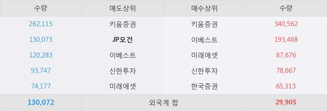 이 시각 주요 거래원은 미래에셋, 키움증권, 이베스트 등이 매수 상위 창구에 자리하고 있다. 한편, 매도 창구 상위에는 JP모건이 눈에 띄고 있다.