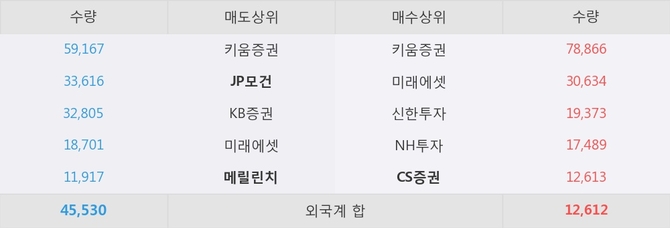 거래원 동향은 CS증권, 미래에셋, NH투자 등이 매수 상위 목록에 나타나고 있다. 한편, 매도 창구 상위에는 JP모건과 메릴린치가 눈에 띄고 있다.