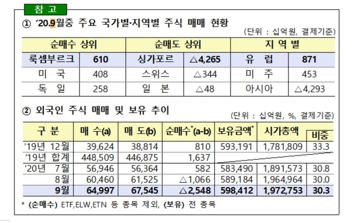 순매수 규모는 룩셈부르크(6천100억원), 미국(4천80억원), 독일(2천580억원) 순이었다.