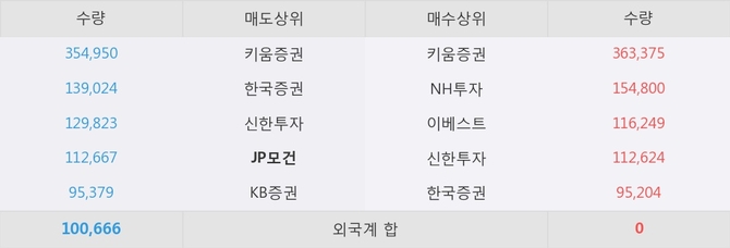 이 시각 주요 거래원은 NH투자, 키움증권, 이베스트 등이 매수 상위 창구에 자리하고 있다. 한편, 매도 창구 상위에는 JP모건이 눈에 띄고 있다.
