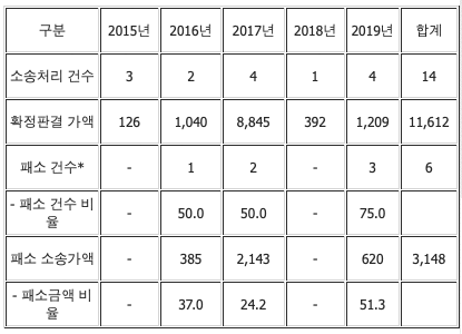 패소 소송가액은 3천148억원으로 집계됐다.