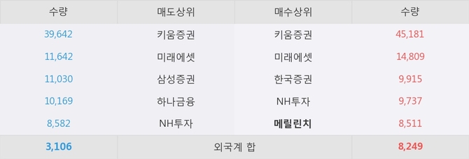 거래원 동향은 메릴린치, 미래에셋, NH투자 등이 매수 상위 목록에 나타나고 있다.