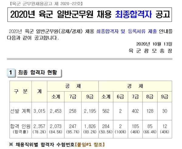 13일 '육군 군무원 채용관리' 홈페이지에서는 '2020년 육군 일반군무원 채용 최종합격자 공고'가 발표됐다. 최종 합격자 현황은 총 2,357명으로 공채 2,073명, 경채 284명이다.