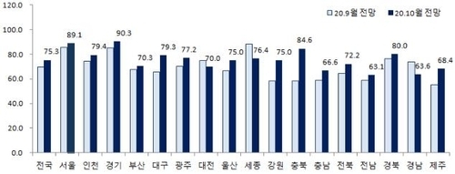 경기도의 전망치가 90.3으로 유일하게 90선을 기록했고, 서울(89.1)과 충북(84.6), 경북(80.0)이 80선, 인천(79.4), 대구(79.3), 광주(77.2), 세종(76.4) 등 대부분 지역은 60∼70선에 머물렀다.