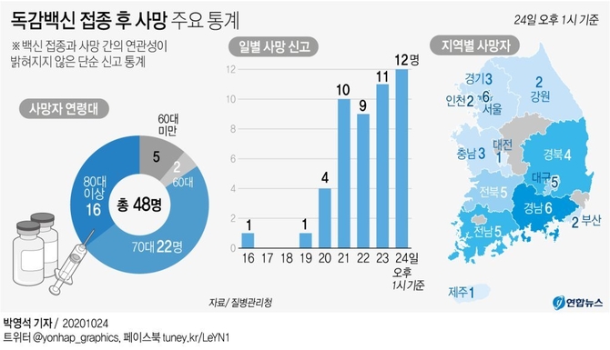 질병청에 따르면 독감백신 접종 후 사망자는 이날 오후 1시 기준 48명으로 집계돼 전날(36명)보다 12명 늘었다. 다만 이들의 사망과 백신 접종 간 인과성이 확인된 것은 아니다.