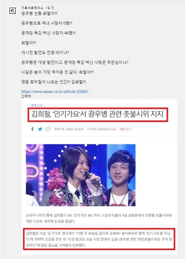 24일 가로세로연구소(이하 '가세연')는 유튜브 커뮤니티를 통해 과거 방송에서 김희철이 광우병 관련 촛불시위를 독려한 기사를 캡처해 올리며 맹비난했다.