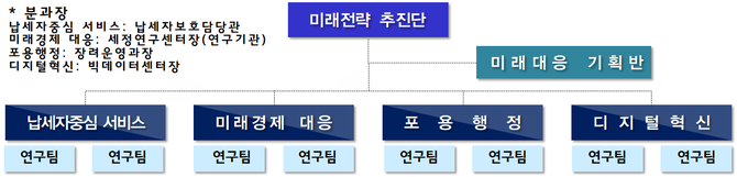 2030 국세행정 미래전략 추진단 역시 연구기관과 경제단체의 참여하에 중장기적인 관점에서 납세자중심 서비스, 미래경제 대응, 포용행정, 디지털 혁신을 위한 국세행정 전략을 마련한다.