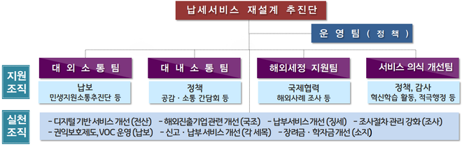 납세서비스 재설계 추진단은 연구기관과 경제단체가 공동으로 참여하며, 민간에서 제시된 개선 의견을 수집해 전문연구기관의 자문을 통해 획기적인 변화를 정착시키는 업무를 맡는다.