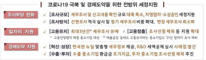 국세청은 세정지원의 물꼬를 취약한 중소기업에 집중해 매출급감 등 어려운 여건 속에서도 고용을 유지하는 중소기업에 대해서는 내년 말까지 정기 세무조사 대상에서 제외하고, 혁신·수출·투자 중소기업에 대한 세정지원도 강화할 방침이다.