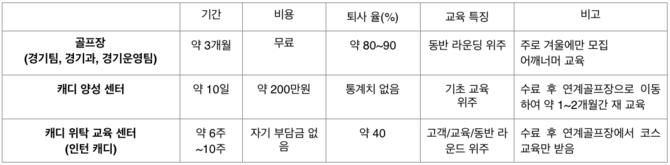 [표. 캐디업무를 배울 수 있는 곳에 대한 비교]