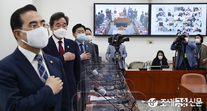 (조세금융신문=김용진 기자) 이낙연 더불어민주당 대표가 27일 국회에서 열린 화상 연결로 의원들과 진행한 온택트 의원총회에서 국민의례를 하고 있다.