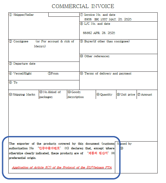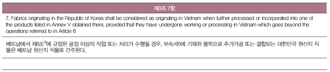 뿐만 아니라 제3조 11항에서 교차누적 적용을 통하여 한국산 직물을 사용했을 때에는 베트남에서 발행하는 원산지증명서에 특정 문구를 삽입할 것을 요구하고 있다. 즉 원산지신고문언이 들어가는 상업서류에 “Application of Article 3(7)of Protocol 1 to the Viet Nam - EU FTA(EU-베트남 FTA원산지 규정 제3조7항의 적용)”를 반드시 기재해야 한다.