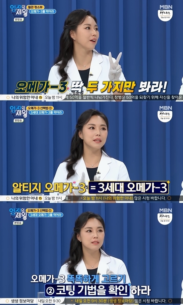 이날 방송에서 패널들은 '오메가3를 똑똑하게 선택하는 방법'에 대한 질문에 윤소정 약사는 "rTG형과 장용성 캡슐인지 확인해라"고 조언했다.