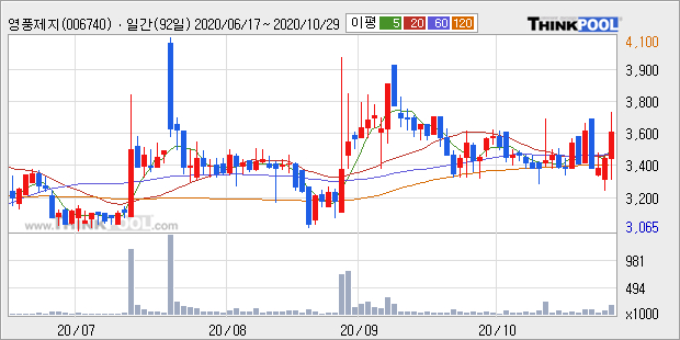 영풍제지는 2019년 매출액 997억원과 영업이익 109억원을 기록했다. 전년대비 매출은 -10.4%, 영업이익은 -39.7% 각각 하락했다. 이 회사의 매출액 증감률과 영업이익 증감률은 각각 코스피 하위 1%, 하위 1%에 해당된다.