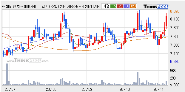 현대비앤지스틸의 2019년 매출액은 전년대비 2.9% 늘어난 7332억원이고, 영업이익 또한 전년대비 4.2% 늘어난 365억원을 기록했다. 이 회사의 매출액 증감률과 영업이익 증감률은 각각 코스피 상위 46%, 상위 50%에 해당된다.