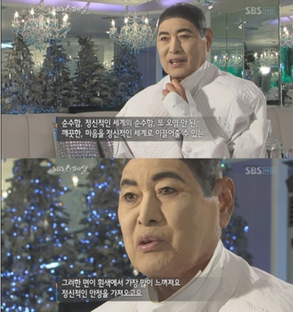 이어 검은색으로 머리를 칠하는 화장법에 대해 "얼굴에 결점이 많아 메이크업을 직접 한다"라며 너스레를 떨었다.