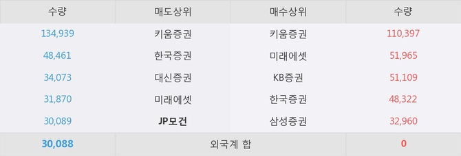 거래원 동향은 미래에셋, 삼성증권 등이 매수 상위 목록에 나타나고 있다. 한편, 매도 창구 상위에는 JP모건이 눈에 띄고 있다.