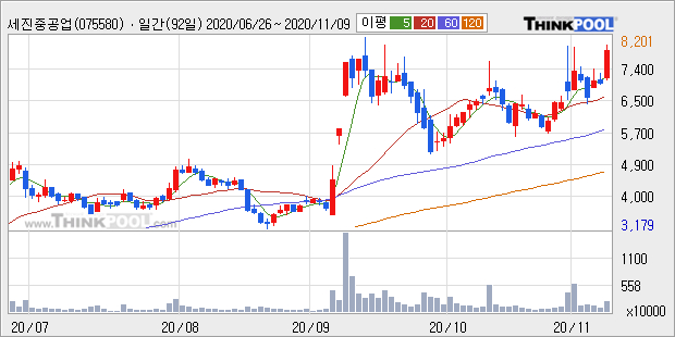 세진중공업의 2019년 매출액은 2959억으로 전년대비 35.6% 상승했고, 영업이익 또한 94억으로 전년대비 11.6% 상승했다. 이 회사의 매출액 증감률과 영업이익 증감률은 각각 코스피 상위 8%, 상위 44%에 해당된다.