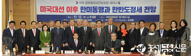 (조세금융신문=김용진 기자) 주호영 원내대표는 12일 국회 의원회관 세미나실에서 개최한 美 대선 결과에 따른 향후 한·미 관계를 진단하고 새롭게 출범할 미국 정부의 對 한반도 정책에 대한 분석을 통해 한국 외교·안보의 대응 방안을 모색하고자 마련한 국회 글로벌외교안보포럼 세미나에서 참석자들과 기념 촬영을 하고 있다.