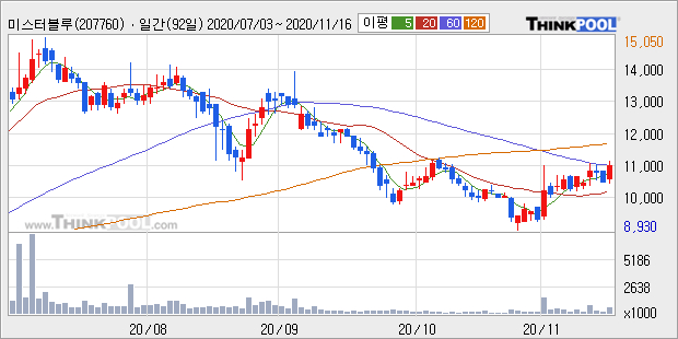미스터블루의 2019년 매출액은 639억으로 전년대비 106.2% 상승했고, 영업이익 또한 139억으로 전년대비 250.9% 상승했다. 이 회사의 매출액 증감률과 영업이익 증감률은 각각 코스닥 상위 4%, 상위 7%에 해당된다.