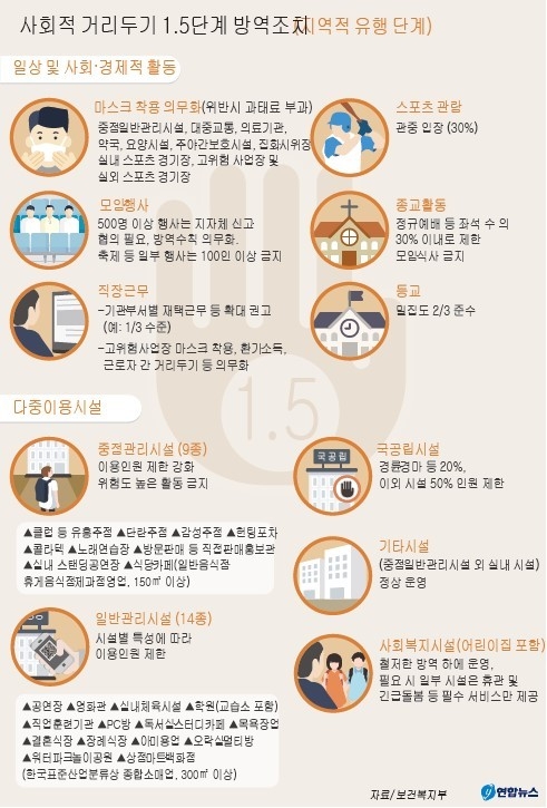 정부는 17일 수도권의 사회적 거리두기를 1단계에서 1.5단계로 격상하기로 했다.