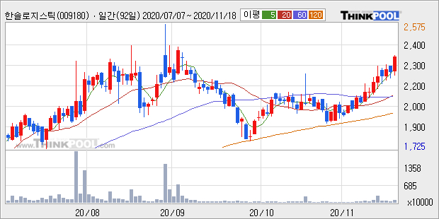 한솔로지스틱스는 2019년 매출액 4607억원과 영업이익 95억원을 기록했다. 전년대비 매출은 6.1%, 영업이익은 144.1% 각각 상승했다. 이 회사의 매출액 증감률과 영업이익 증감률은 각각 코스피 상위 34%, 상위 11%에 해당된다.