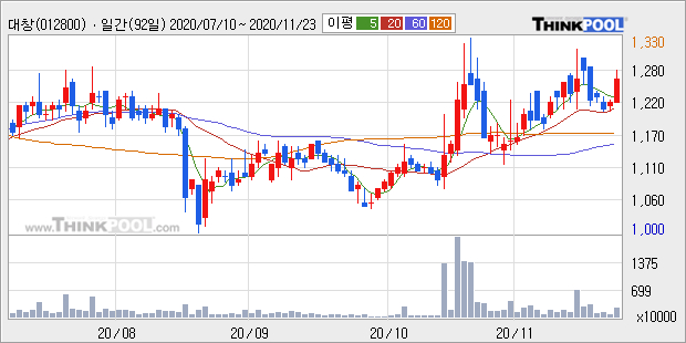차트상 주가의 흐름은 현재 단기·중기 이평선이 정배열 상태로 전형적인 상승세를 보이고 있다. 이 종목의 차트에서 최근에 최근 60일 매물대 돌파, 최근 5일 매물대 돌파, 주가 5MA 상향돌파 등을 확인할 수 있다