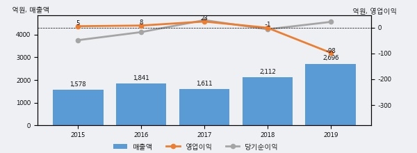 최근 실적을 살펴보면 2019년 매출액이 최근 5년 중 가장 높은 실적을 기록했음을 알 수 있다. 이전 최고 실적이었던 2018년 보다도 27.7%(584억 2천만원) 늘어난 것으로 나타났다.