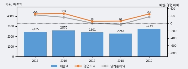 최근 실적을 살펴보면 2019년 매출액이 최근 5년 중 가장 높은 실적을 기록했음을 알 수 있다. 이전 최고 실적이었던 2016년 보다도 6.1%(157억 7천만원) 늘어난 것으로 나타났다.