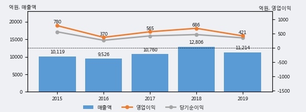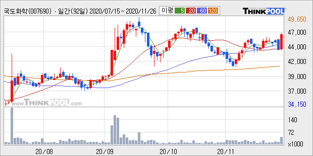 국도화학의 2019년 매출액은 전년대비 -12.4% 줄어든 1조 1214억원이고, 영업이익 역시 전년대비 -38.6% 줄어든 421억원을 기록했다. 이 회사의 매출액 증감률과 영업이익 증감률은 각각 코스피 하위 11%, 하위 25%에 해당된다.