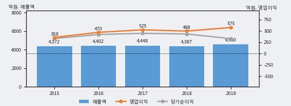 최근 실적을 살펴보면 2019년 매출액이 최근 5년 중 가장 높은 실적을 기록했음을 알 수 있다. 이전 최고 실적이었던 2017년 보다도 2.5%(112억 1천만원) 늘어난 것으로 나타났다.